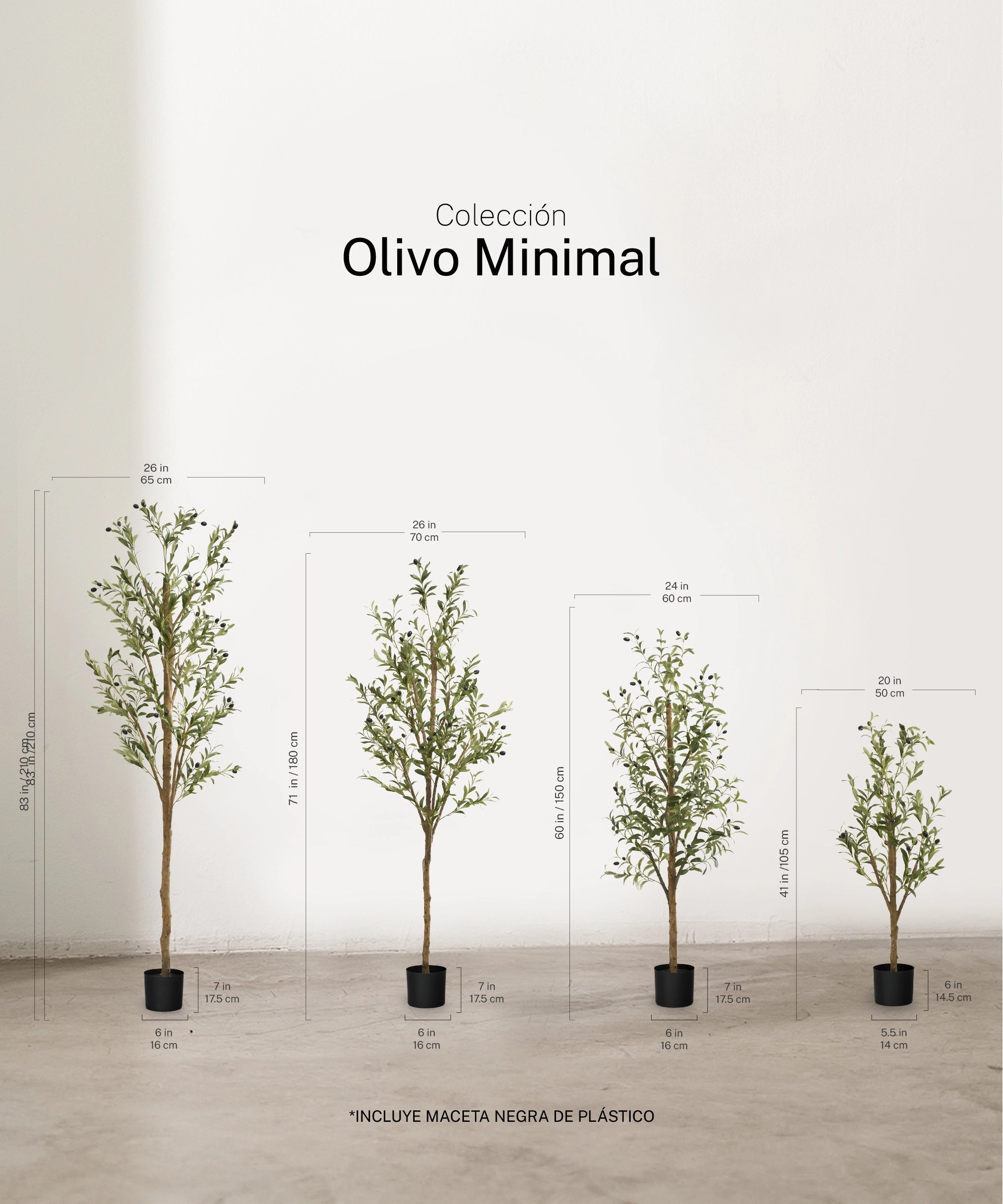 Disponible en 105 cm, 150 cm, 180 cm y 210 cm, el Olivo artificial Minimal se adapta a distintos espacios y necesidades decorativas. Las alturas más contenidas funcionan muy bien en rincones o entradas, mientras que las versiones más altas destacan en interiores amplios como puntos focales de diseño.