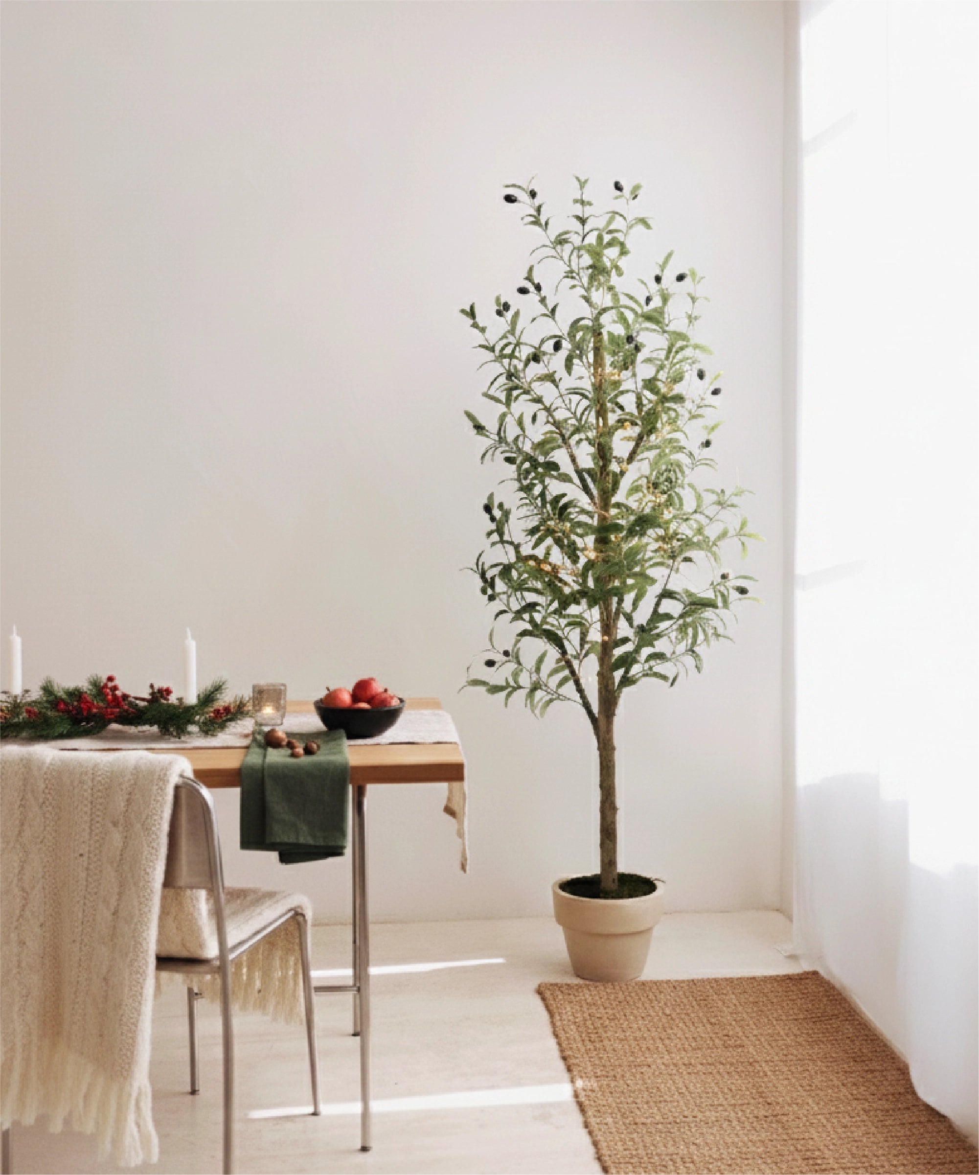 Las hojas de acabado natural y las aceitunas decorativas están integradas con precisión para conseguir un efecto realista y armonioso. Un árbol artificial que transmite autenticidad sin necesidad de mantenimiento.