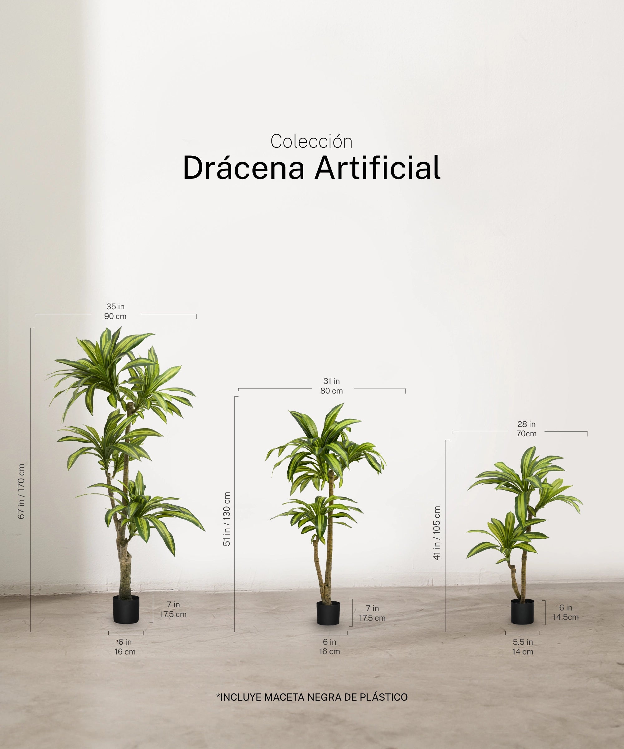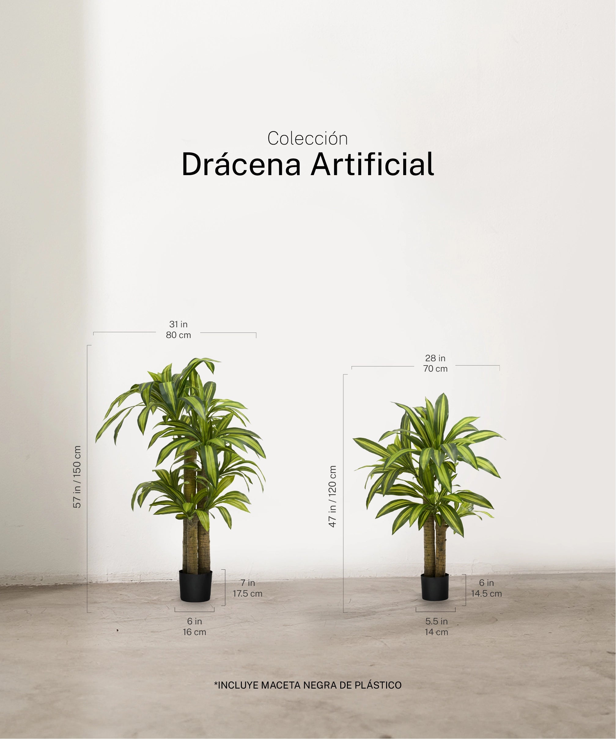 Disponibile in 105 cm, 120 cm, 130 cm, 150 cm e 170 cm, la dracena artificiale si adatta a diversi stili ed esigenze decorative. Inoltre, è disponibile con diversi spessori del tronco, permettendo di scegliere da una presenza più leggera e slanciata fino a una versione con maggiore corpo visivo, ideale per creare un punto focale più marcato.