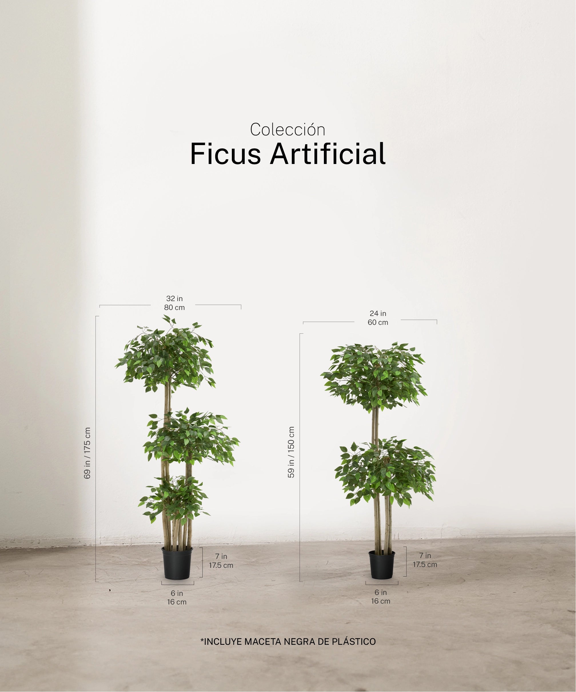 Disponible en versión de 2 copas o 3 copas, este Ficus artificial se adapta a diferentes volúmenes y necesidades decorativas. Ideal para salones, entradas, oficinas, hoteles o proyectos de interiorismo que buscan una pieza protagonista.