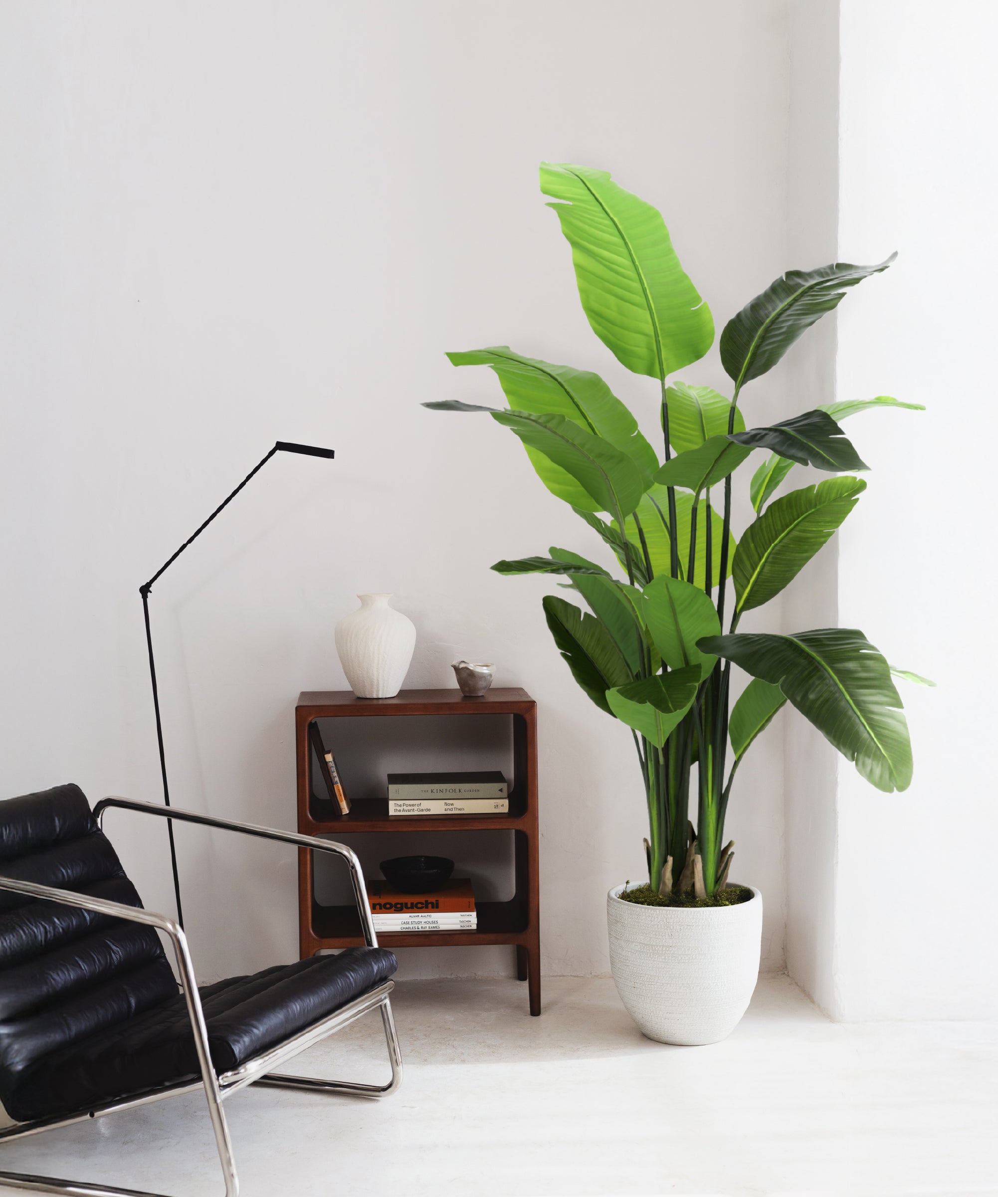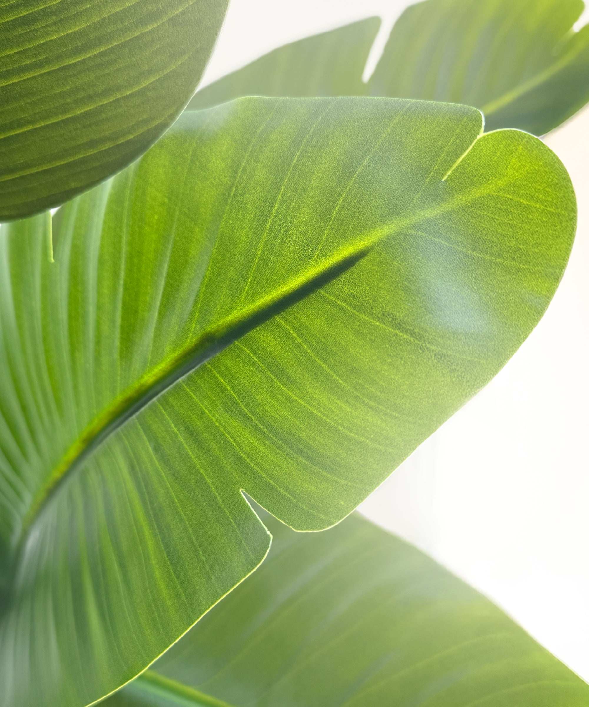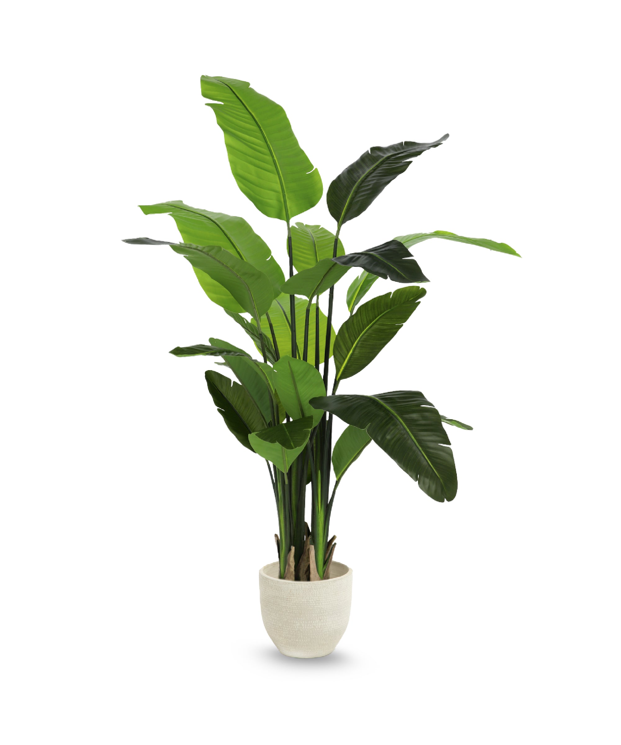 A sua estrutura vertical, acompanhada de folhas longas e abertas, recria o estilo natural da Strelitzia. Tanto as folhas como os caules são flexíveis e moldáveis, permitindo personalizar a sua forma e adaptá-la ao espaço, alcançando um efeito mais realista e natural.